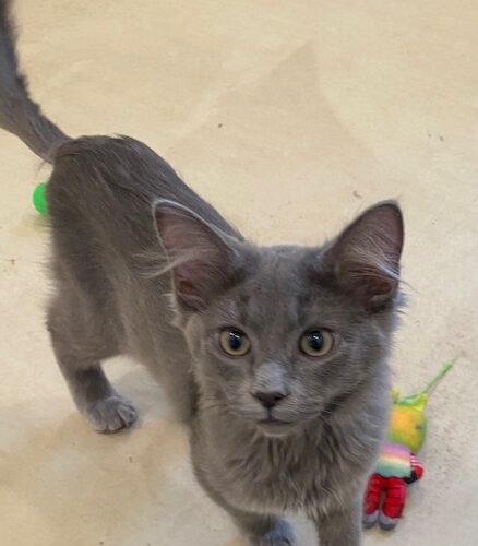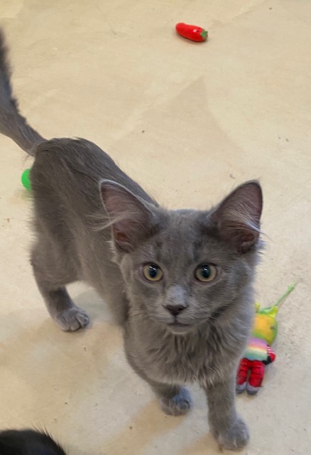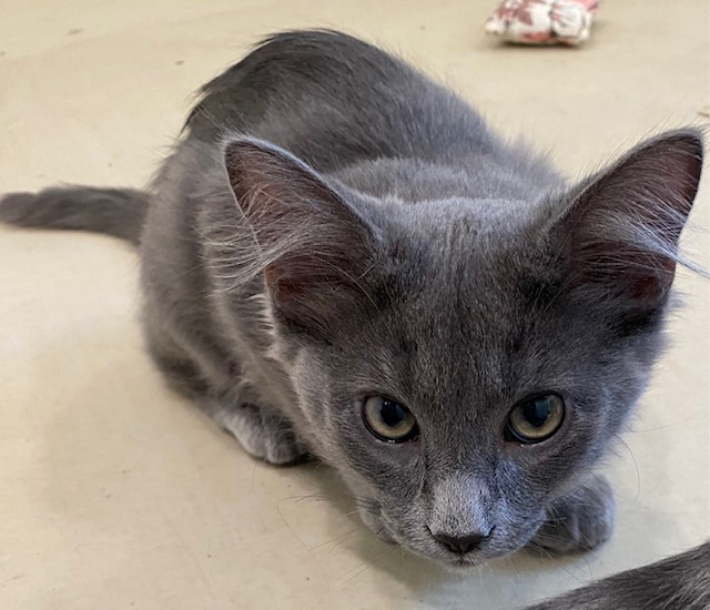 Storm Cloud is a sweet and curious 4-month-old kitten (born 4/28/25) who loves to play. Initially shy, he quickly warms up to new people. Born at the shelter to his mom, Mama Mia, he's one of five siblings, with two already adopted. He gets along wonderfully with his remaining siblings, Celecia and Alesana, as well as his mom. While he hasn't met other cats or dogs yet, his young age suggests he'll adapt easily.
